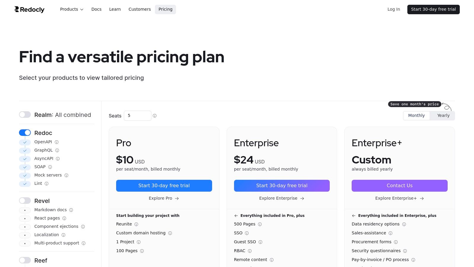), allowing for gradual investment.Redocly offers several tiers. The Community edition (Redoc) is open-source and free. The Starter plan is priced at $79/month, offering core developer portal features for smaller teams. The Business plan adds SSO, RBAC, and advanced governance features, while the Enterprise tier provides a custom solution with dedicated support. They also offer a startup discount program, making it accessible for new ventures.