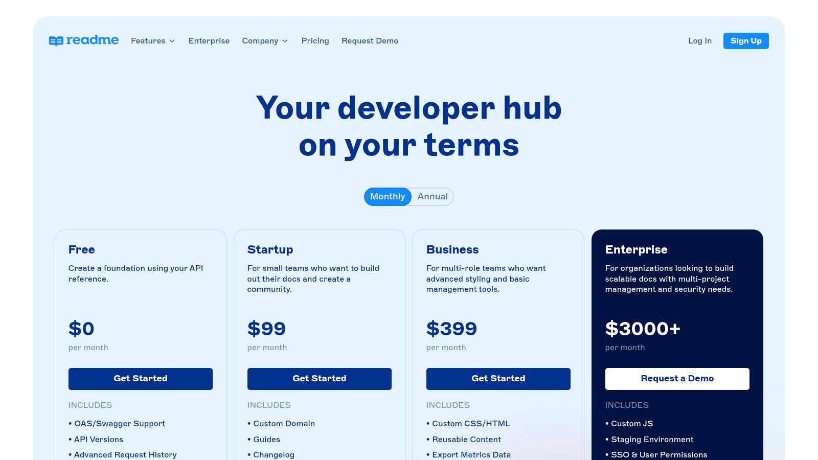 ReadMe’s pricing starts with a Free plan for open-source projects, which includes the core documentation features. The Startup plan begins at $99/month per project and is aimed at small teams needing a custom domain and basic features. The Business and Enterprise tiers offer advanced features like API metrics, user-level permissions, and premium support, with pricing available upon request.