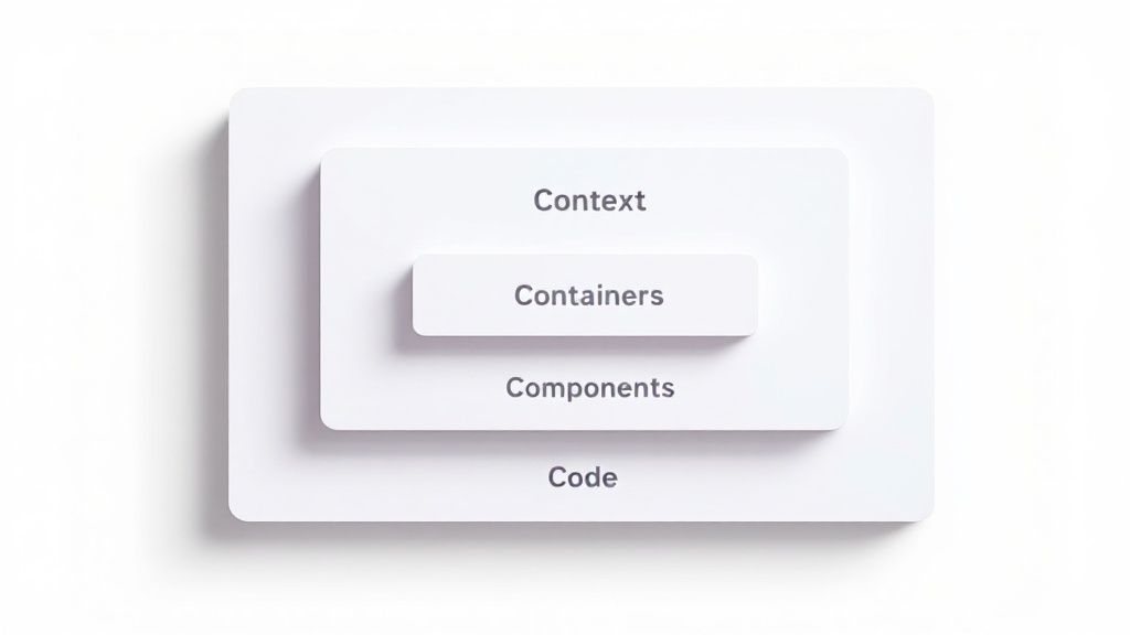 Instead of a single, overwhelmingly complex diagram, the C4 model breaks down the architecture into four distinct levels of abstraction: System Context, Containers, Components, and Code. This layered approach allows you to zoom in and out of the system design, providing the right level of detail for any given conversation. The C4 model isn’t a replacement for UML; it’s a map-making tool for your codebase, guiding viewers from a high-level landscape down to the specific streets and buildings.