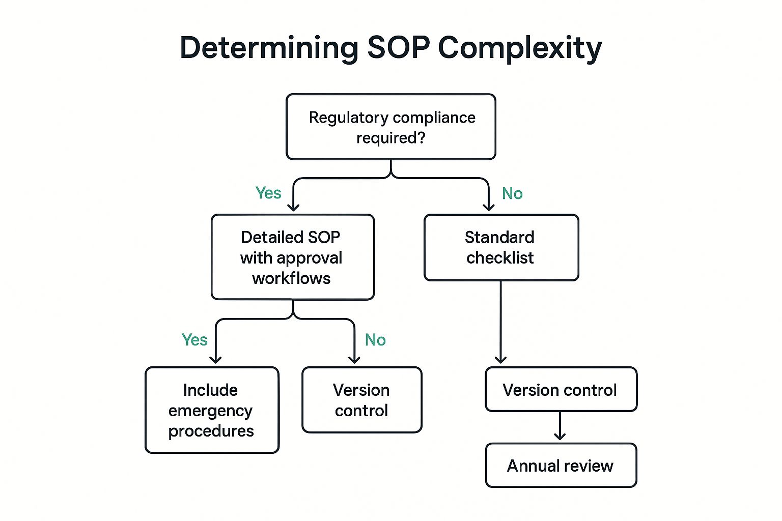 The following decision tree illustrates how to determine the necessary complexity and components of an SOP based on key operational factors.