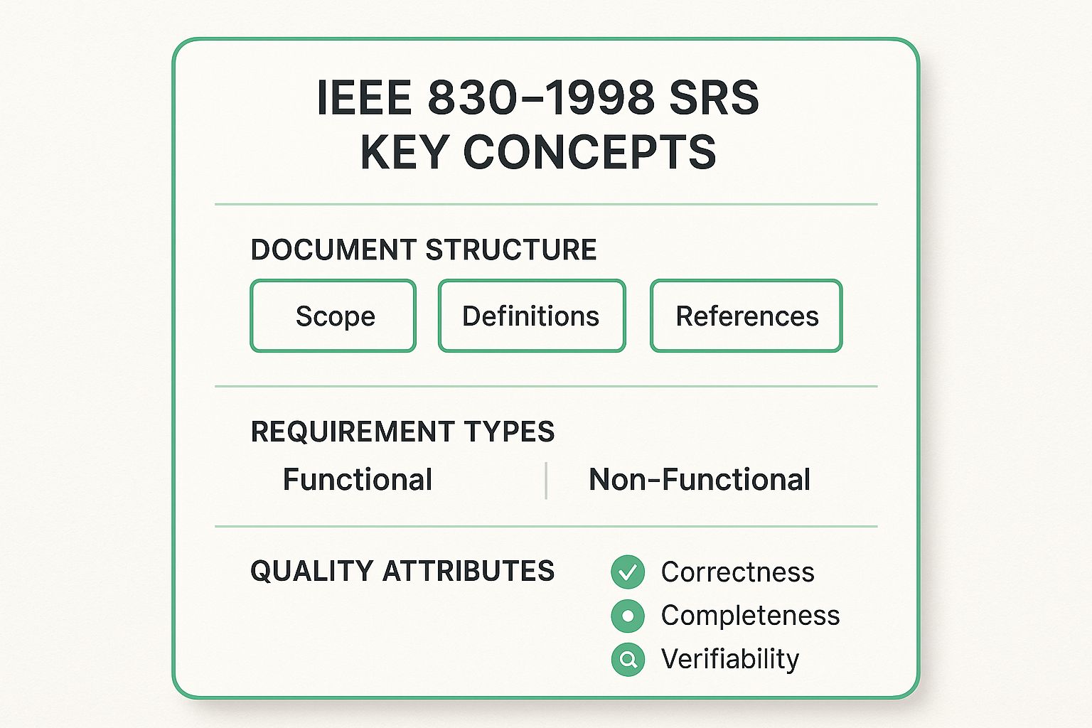 The following infographic highlights the foundational concepts of the IEEE 830-1998 framework, breaking down its structure, requirement types, and key quality attributes.