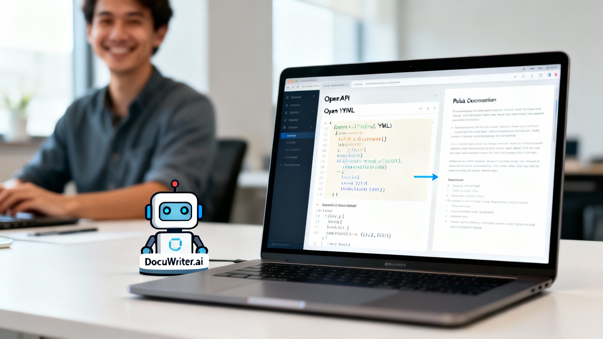 This is where automation changes the game. DocuWriter.ai elevates your workflow by ditching manual spec creation entirely. It looks directly at your codebase to generate, enrich, and maintain your OpenAPI documentation for you. It’s a code-first approach that guarantees your docs are always a perfect, up-to-the-minute reflection of how your API actually works.
